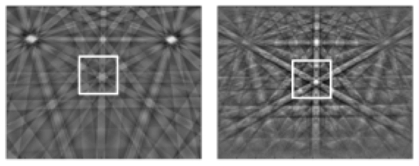 Region of interest (ROI) highlighted in a reference-simulated pattern (left), and real silicon EBSD pattern with the corresponding ROI marked for comparison via cross correlation.